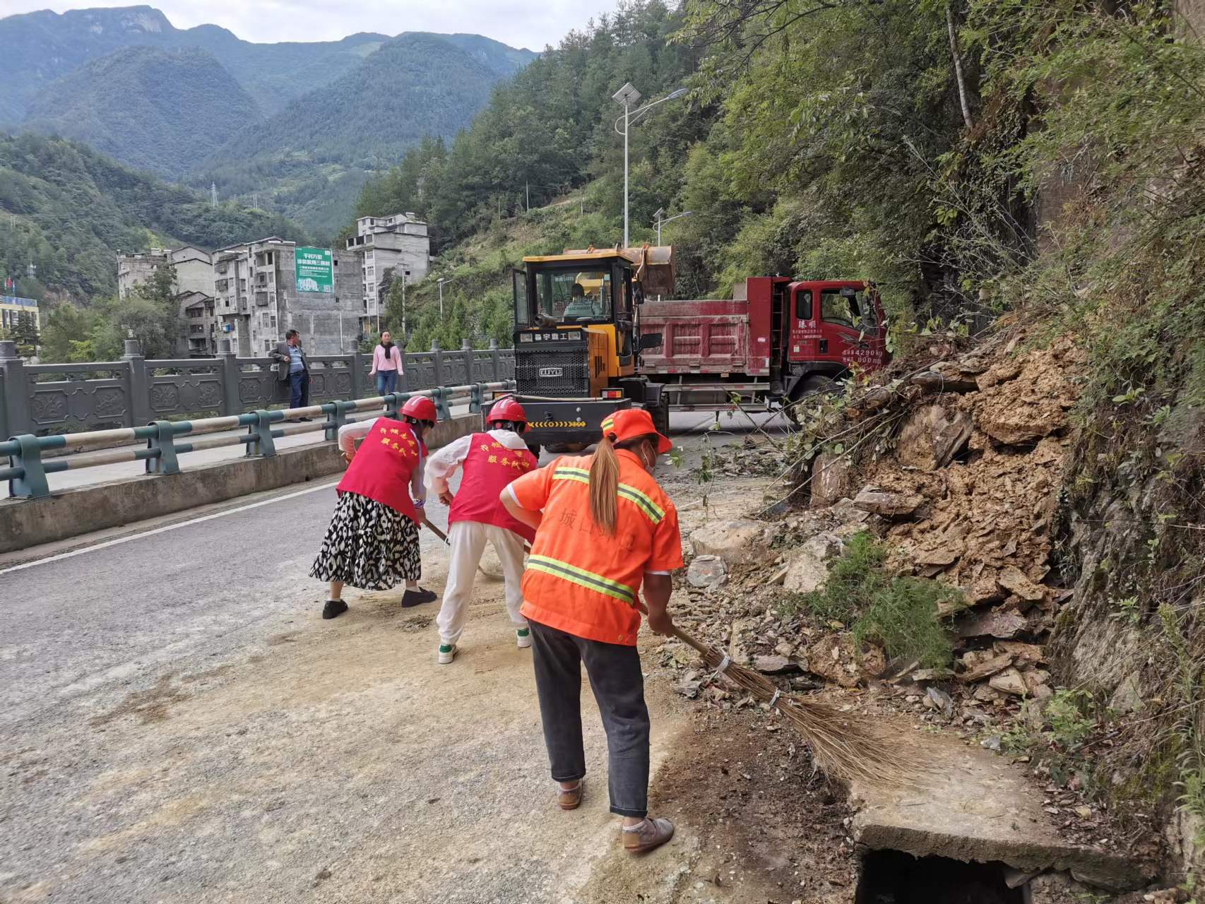 明通:山体塌方道路受阻 社区干部紧急排危